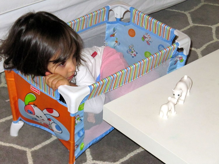 Assistindo TV dentro do berco da sua boneca. Linda!